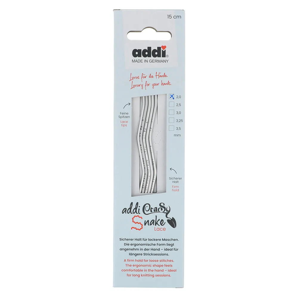 Die CrasySnake Strumpfstricknadeln von Addi sind aus Aluminium gefertigt. Das macht die Nadeln leicht und widerstandsfähig. Die spezielle, gewellte Form sorgt für ein angenehmes Strickerlebnis, egal ob Sie Socken oder feine Zopfmuster stricken. Die Form sorgt auch dafür, dass Sie Kontrolle über die Nadeln haben und die Maschen nicht von den Nadeln rutschen. Dies ist besonders für beginnende Strickbegeisterte oder Strickerinnen mit lockerer Fadenspannung nützlich. Die Nadelstärke ist auf jeder Nadel deutlich angegeben. De Addi CrasySnake Strumpfstricknadeln sind 15cm lang und in den Nadelstärken 2.00, 2.50, 3.00, 3.25 und 3.50mm erhältlich. Ein Set/Nadelspiel besteht aus 5 Strumpfstricknadeln.