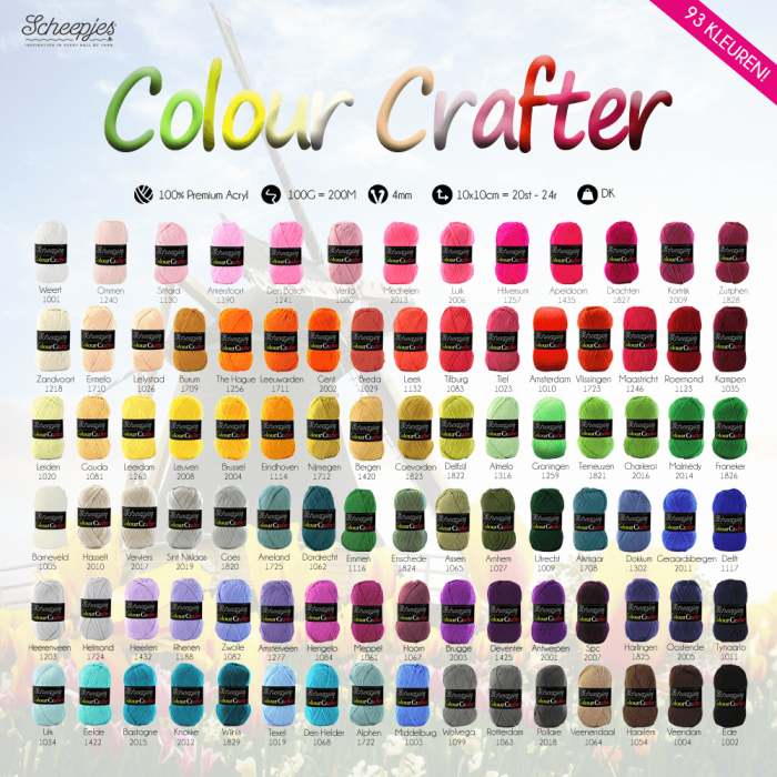 Scheepjes Colour Crafter ist ein hochwertiges Garn aus 100% Acryl mit Antipilling Eigenschaften, das seidenweich und wunderschön glatt ist und bleibt. Die extra großen Knäuel von 100 Gramm (Garndicke DK) eignen sich besonders gut zum Stricken oder Häkeln von großen Wohnaccessoires, wie Decken und Kissen, aber natürlich auch für Spielzeug, Amigurumi oder Kleidung. Scheepjes Colour Crafter ist in sehr vielen lebendigen Farben erhältlich, die alle nach niederländischen und belgischen Orten benannt sind. Dieses besonders beliebte Garn ist hypoallergen und pflegeleicht.
