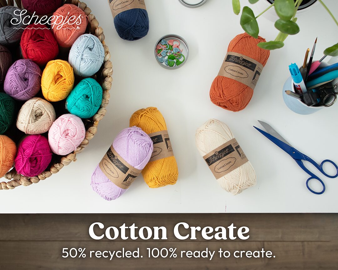 Scheepjes Cotton Create ist ein neues Garn mit dem gleichen geschmeidigen Faden, matter Optik, Gewicht und Maschenprobe wie das bewährte Scheepjes Cotton 8. Es ist eine bewusste Wahl für Kreative, die nach nachhaltigen Alternativen suchen, aber keine Kompromisse bei Qualität und Weichheit eingehen wollen. Cotton Create besteht aus sorgfältig ausgewählten und recycelten Baumwollresten und hochwertiger neuer Baumwolle. Das Garn ist nicht mercerisiert, was ihm ein schönes natürliches, mattes Aussehen verleiht. Jede Farbe hat einen Namen, der den kreativen Prozess widerspiegelt: von Cast On, Finish, Stitch, Spin, bis Patch und Mend: Jeder Farbton ist eine Ode an die Freude, die die Herstellung handgefertigter Artikel bereitet. Dank seiner atmungsaktiven, leichten Struktur ist Cotton Create perfekt für eine Vielzahl von Handarbeitsprojekten. Stricken, Häkeln, Weben, Punch Needle, Kumihimo und Makramee: all das ist mit Cotton Create möglich.