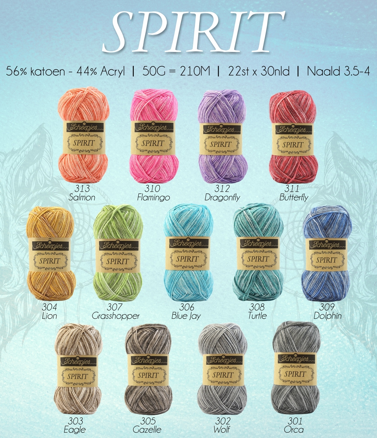 Scheepjes Spirit ist inspiriert von und benannt nach unterschiedlichen Spirit-Tieren, was sich in den wunderschönen, sanften Farbtönen zeigt, in denen das Garn erhältlich ist. Spirit ist aus einem Mix aus 56% Baumwolle und 44% Acryl gemacht und hat einen natürlichen, weichen und warmen Look und Feel. Mit diesem mehrfarbigen Garn stricken oder häkeln Sie prächtige Home-Deko-Artikel, Kleidung, Schals und mehr! Ein Knäuel wiegt 50 Gramm und hat eine großzügige Lauflänge von 210 Metern.